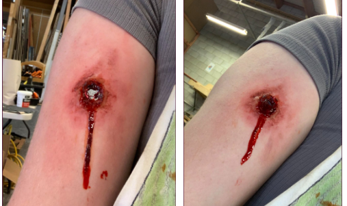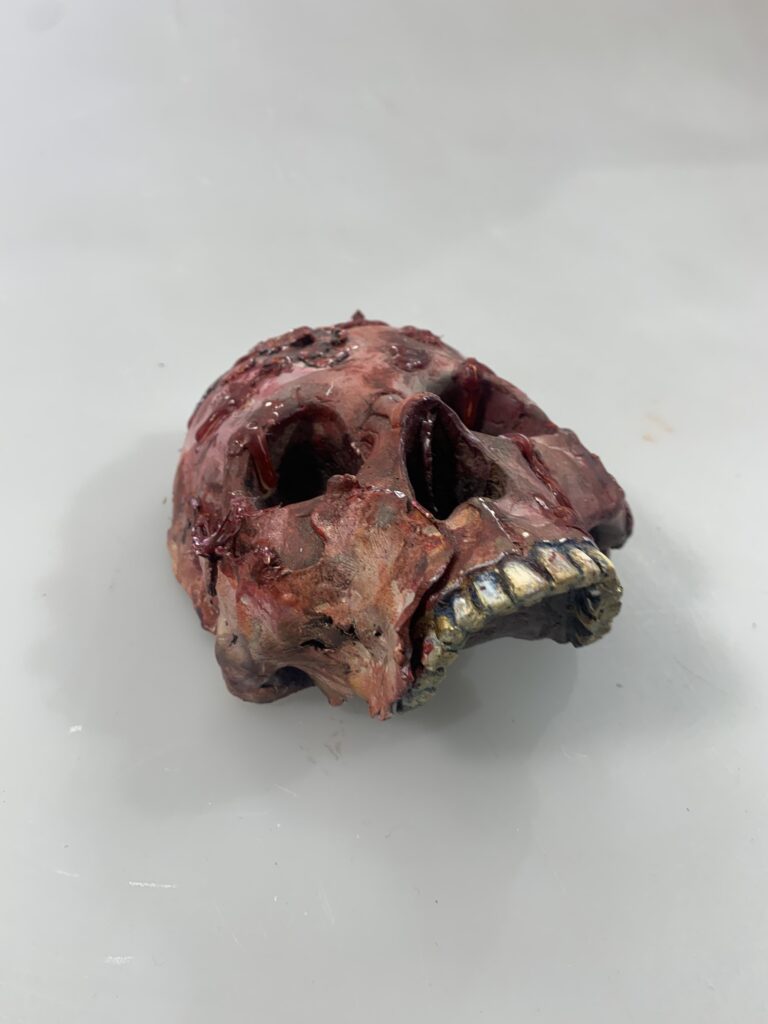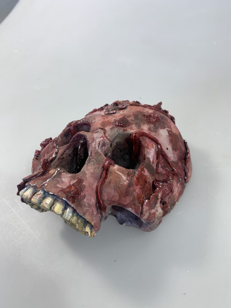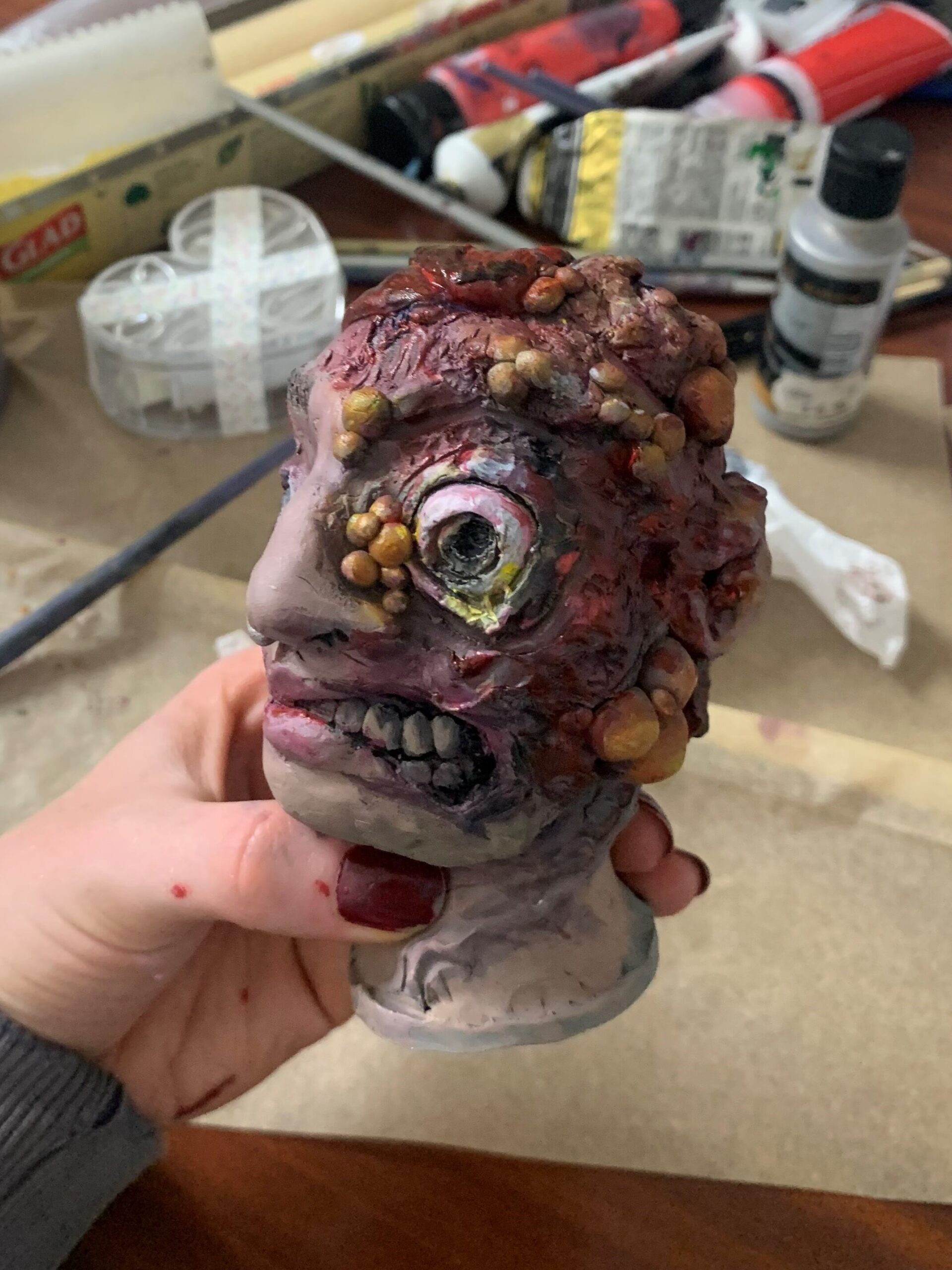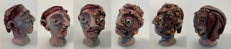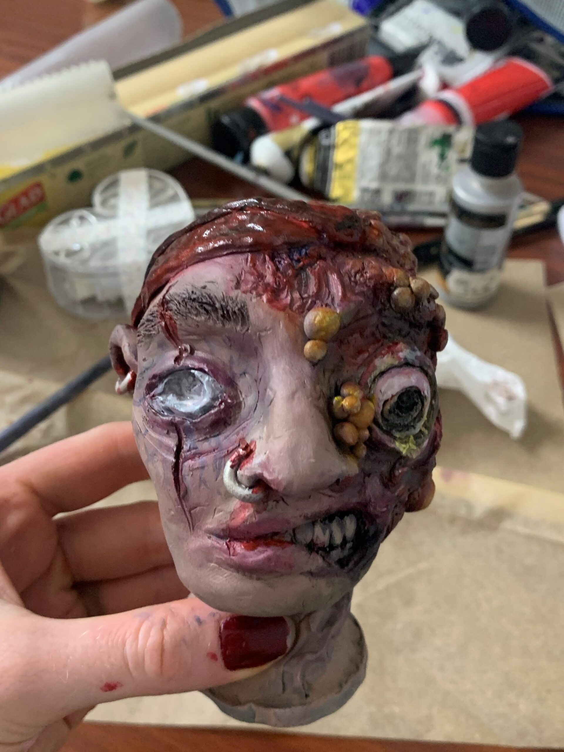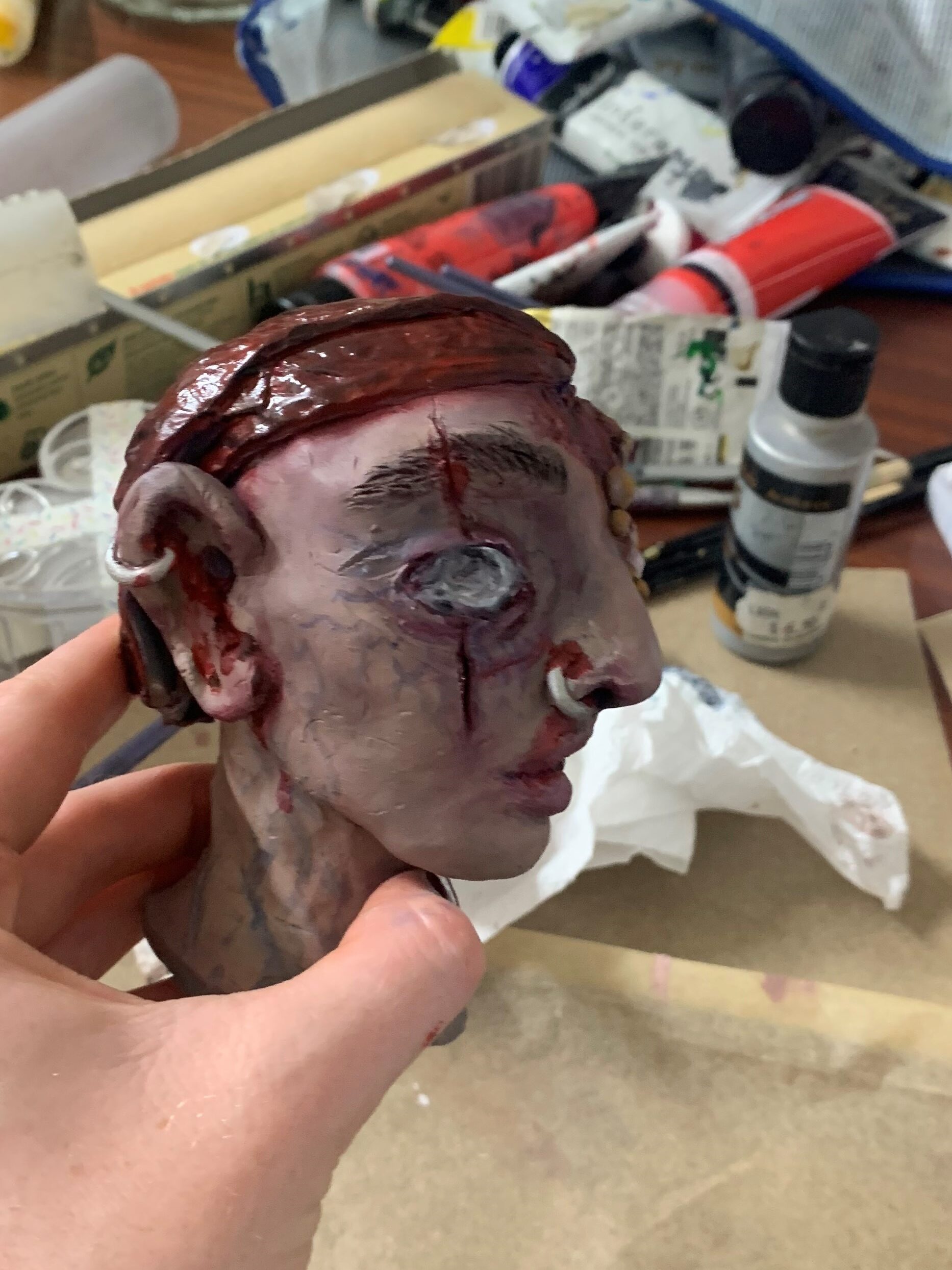 I designed this character from a brief script given to us in my course called “Genetic Misfits”, a post apocalyptic world with radioactivity altered antagonist “pirate like characters. I sculpted his head from sculpey modelling clay, he is primed and painted with acrylic, and gloss sealed on his wounds, with a matt sealant on his skin.