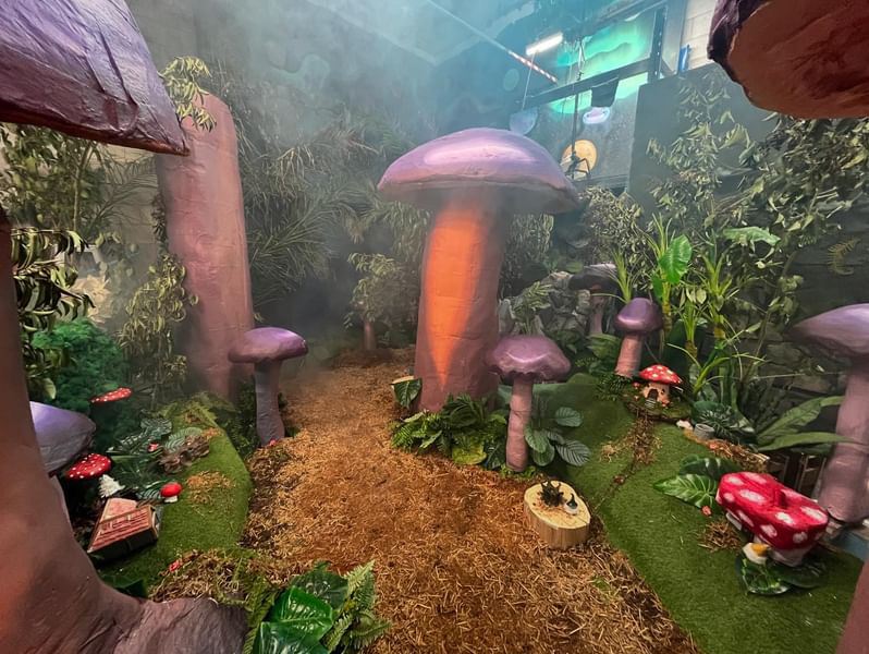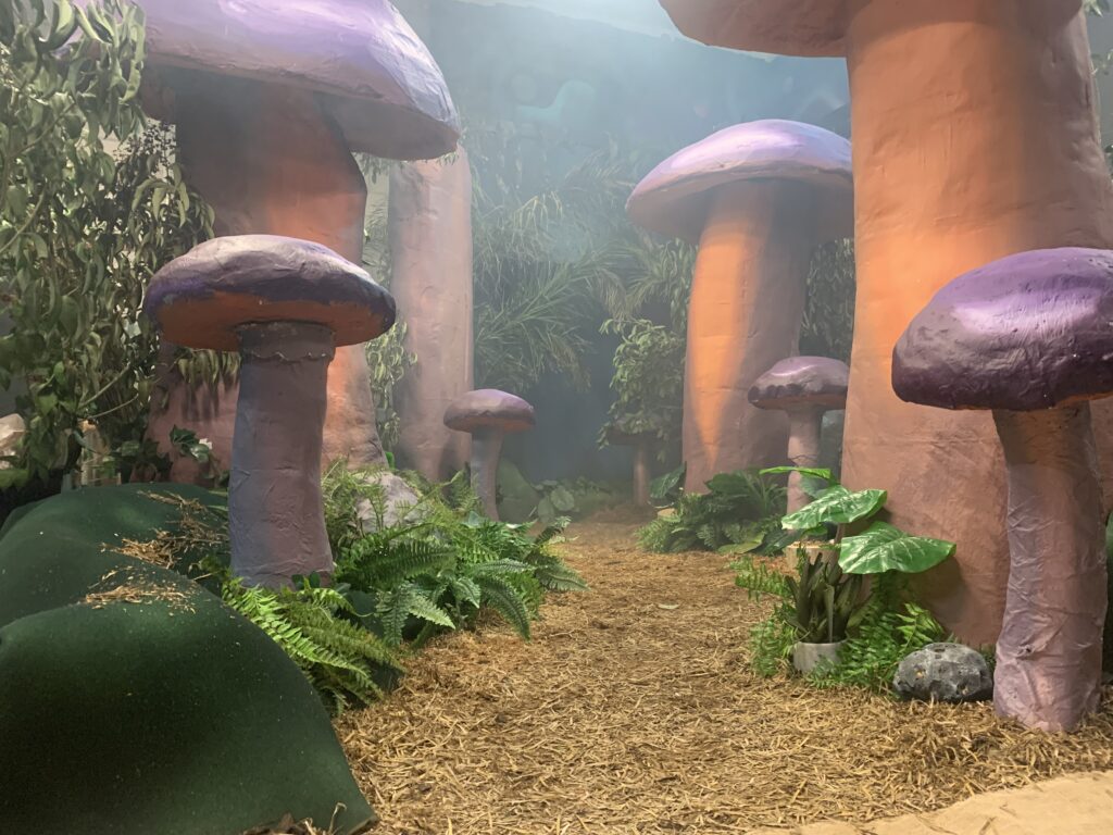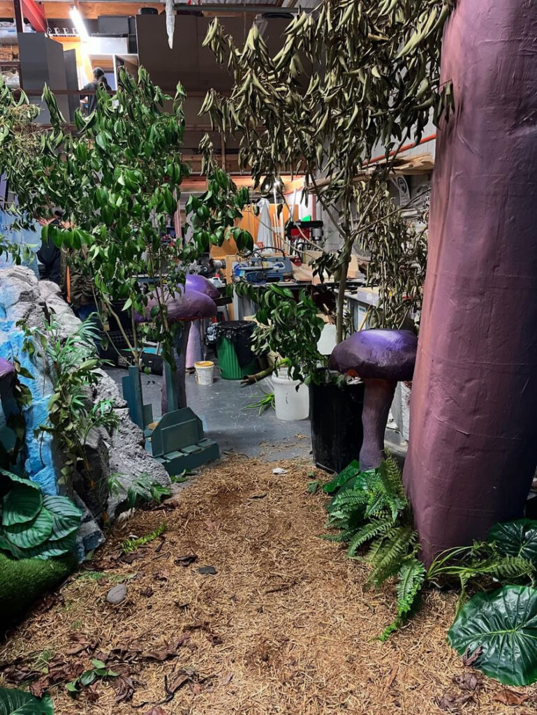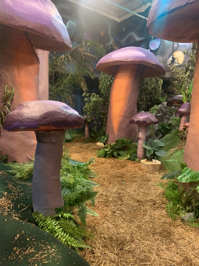 We carved the mushrooms from styrofoam and plasterd over them before painting.