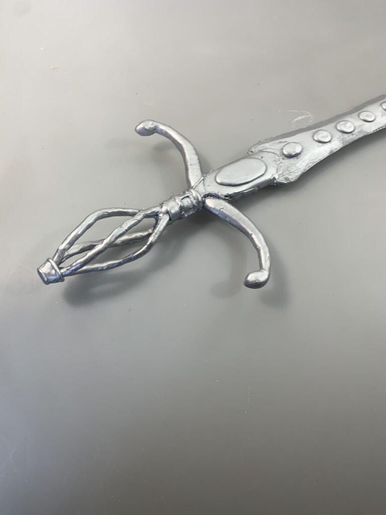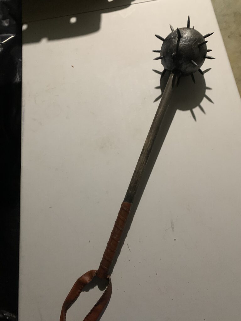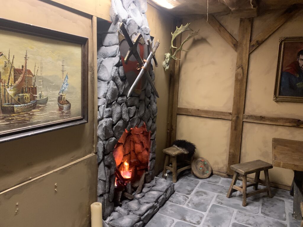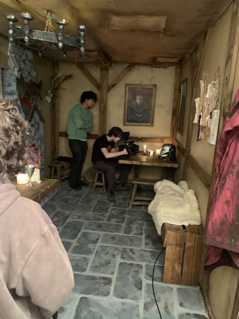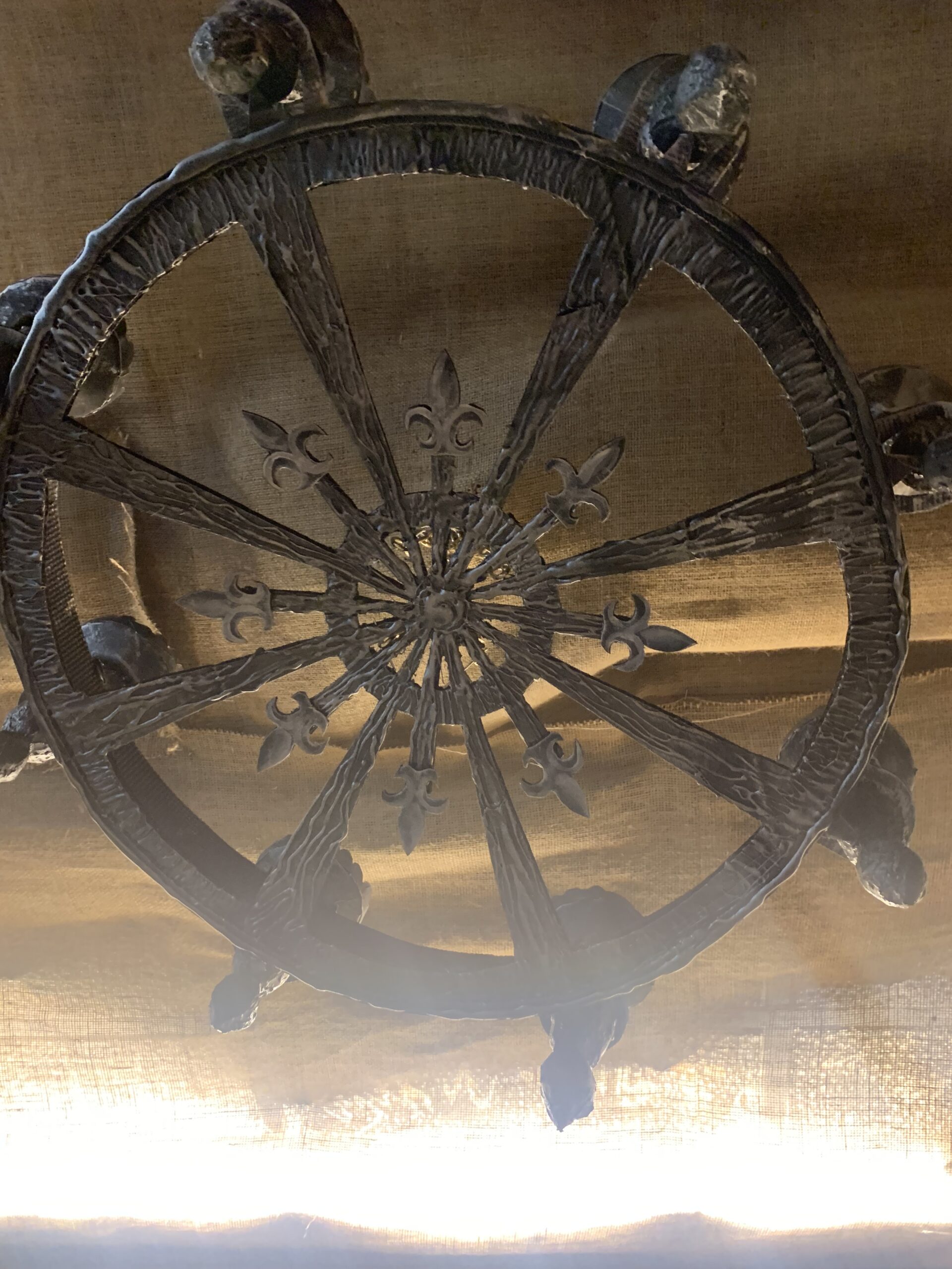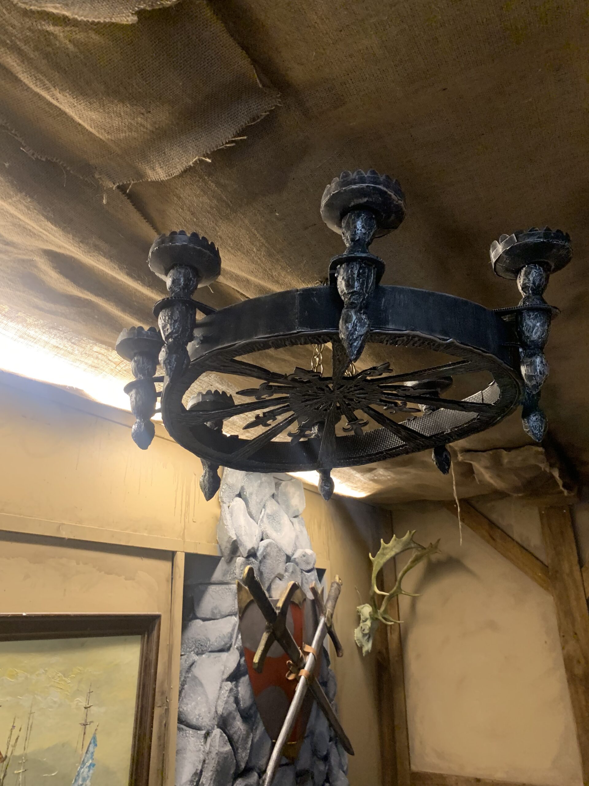 I made this chandelier for a set for a short film that my class made. The set was a medieval fantasy tavern, the chandelier was one of the larger props that i was allocated to design and make for this set. I made the candelabras out of Eva floor mats which I carved on a belt sander and coated in wood putty. The “wheel” is also made from EVA mats reinforced with corrugated plastic and textured with a Dremel and hot glue.