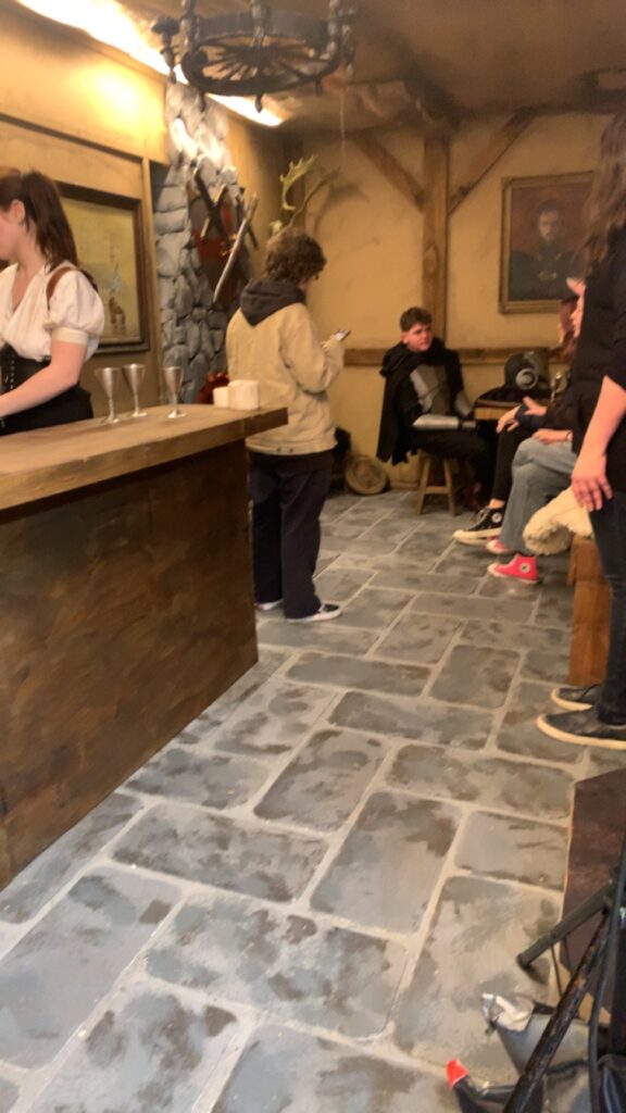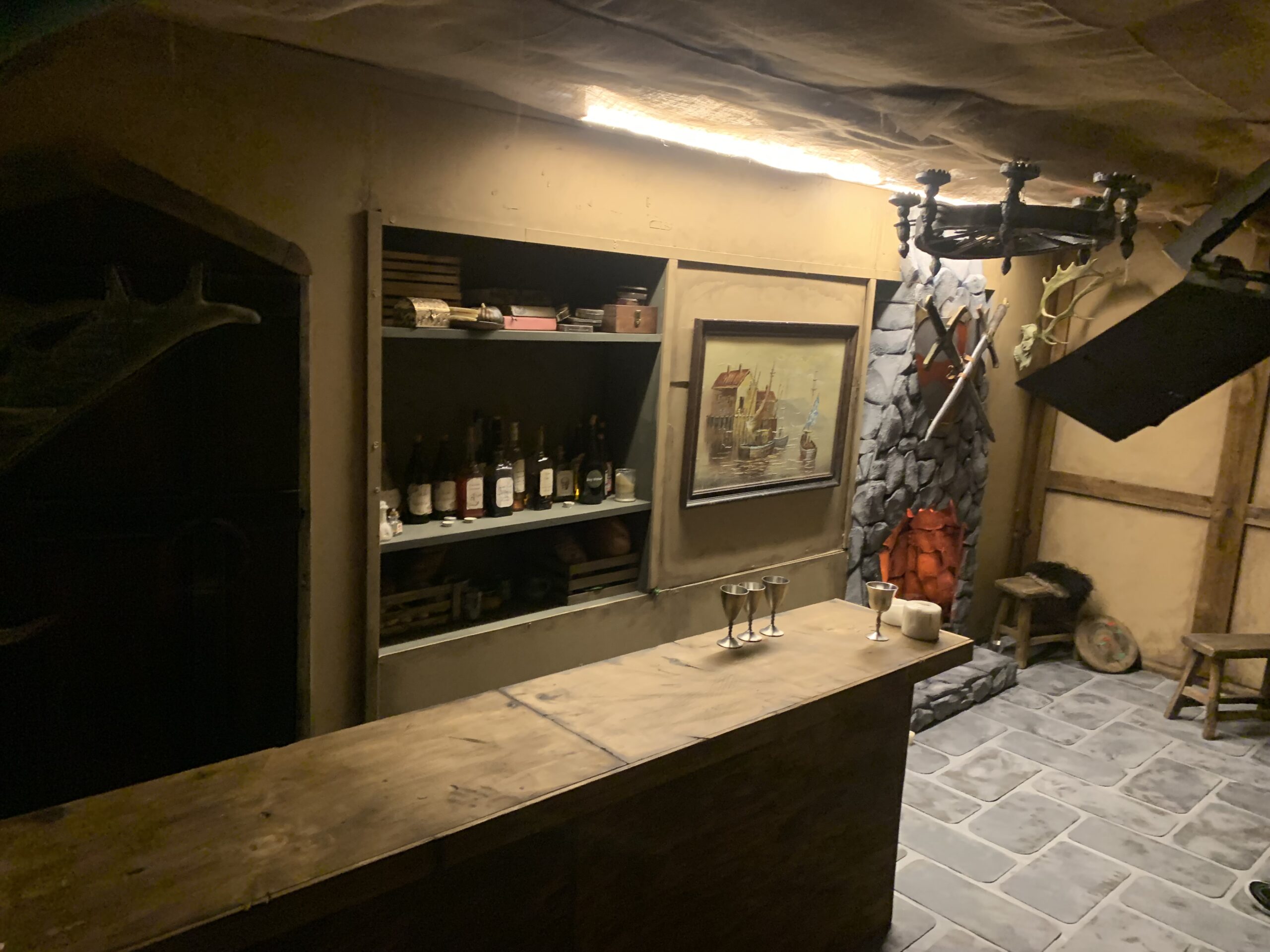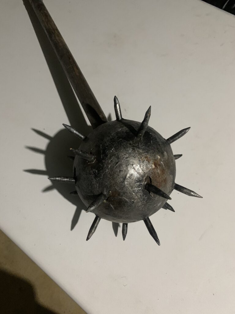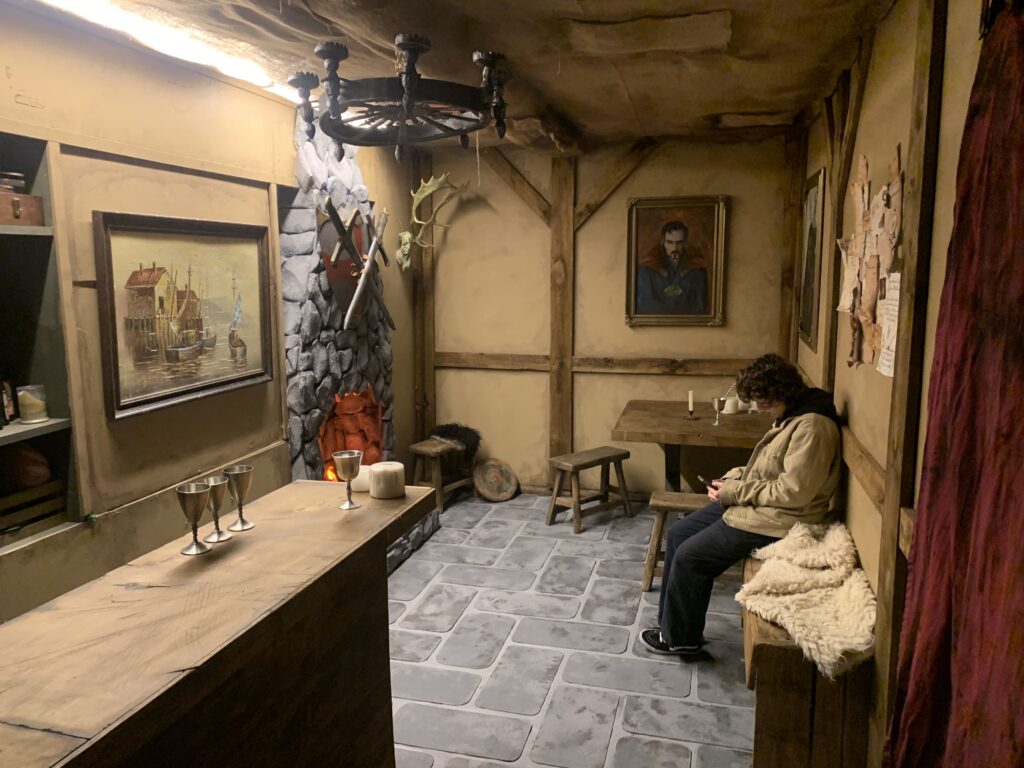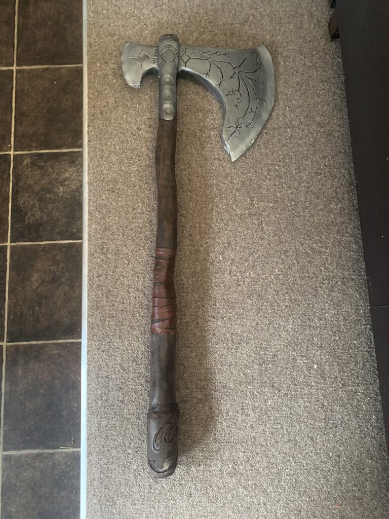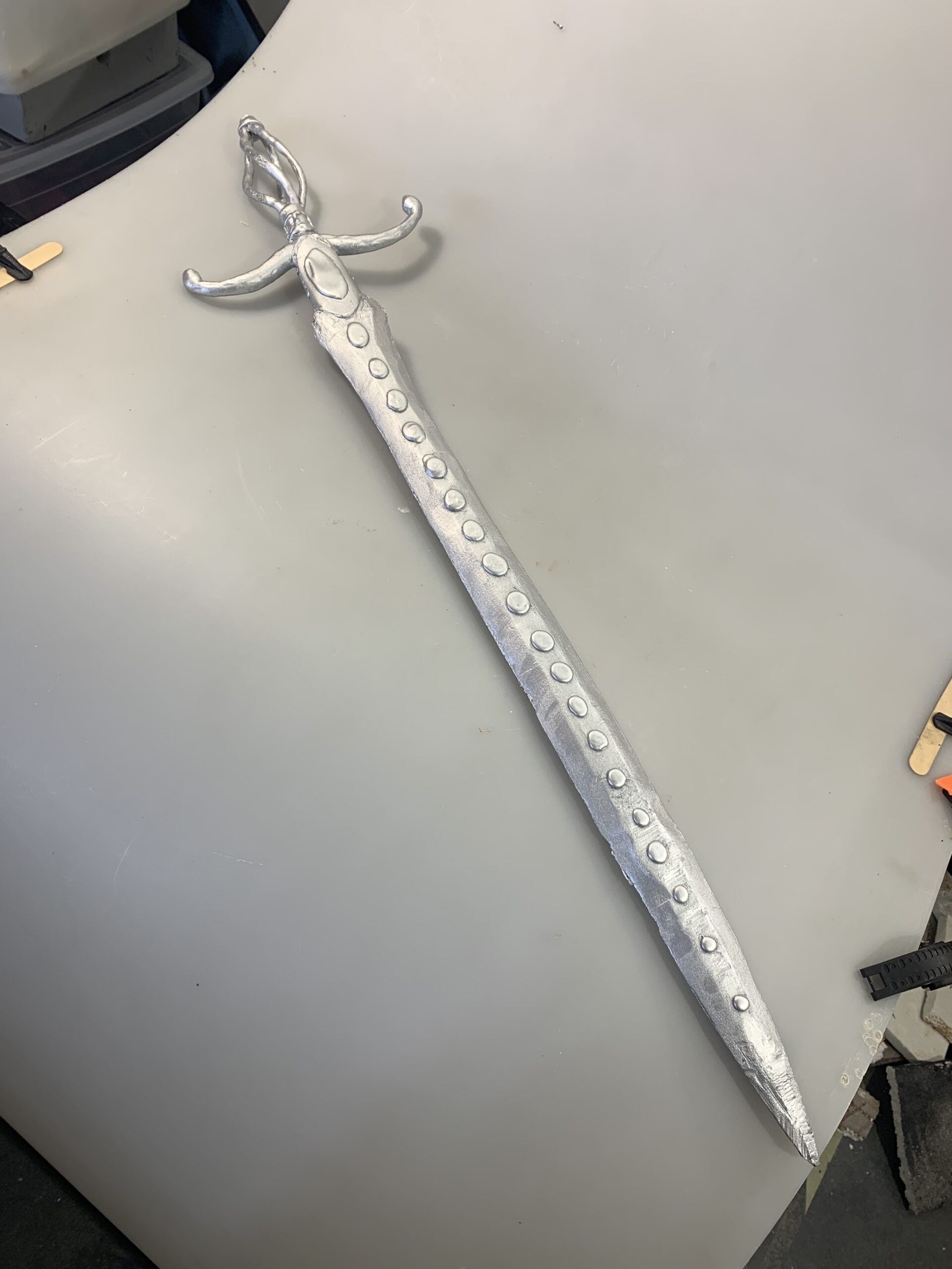 I made this chandelier for a set for a short film that my class made. The set was a medieval fantasy tavern, the chandelier was one of the larger props that i was allocated to design and make for this set. I made the candelabras out of Eva floor mats which I carved on a belt sander and coated in wood putty. The “wheel” is also made from EVA mats reinforced with corrugated plastic and textured with a Dremel and hot glue.